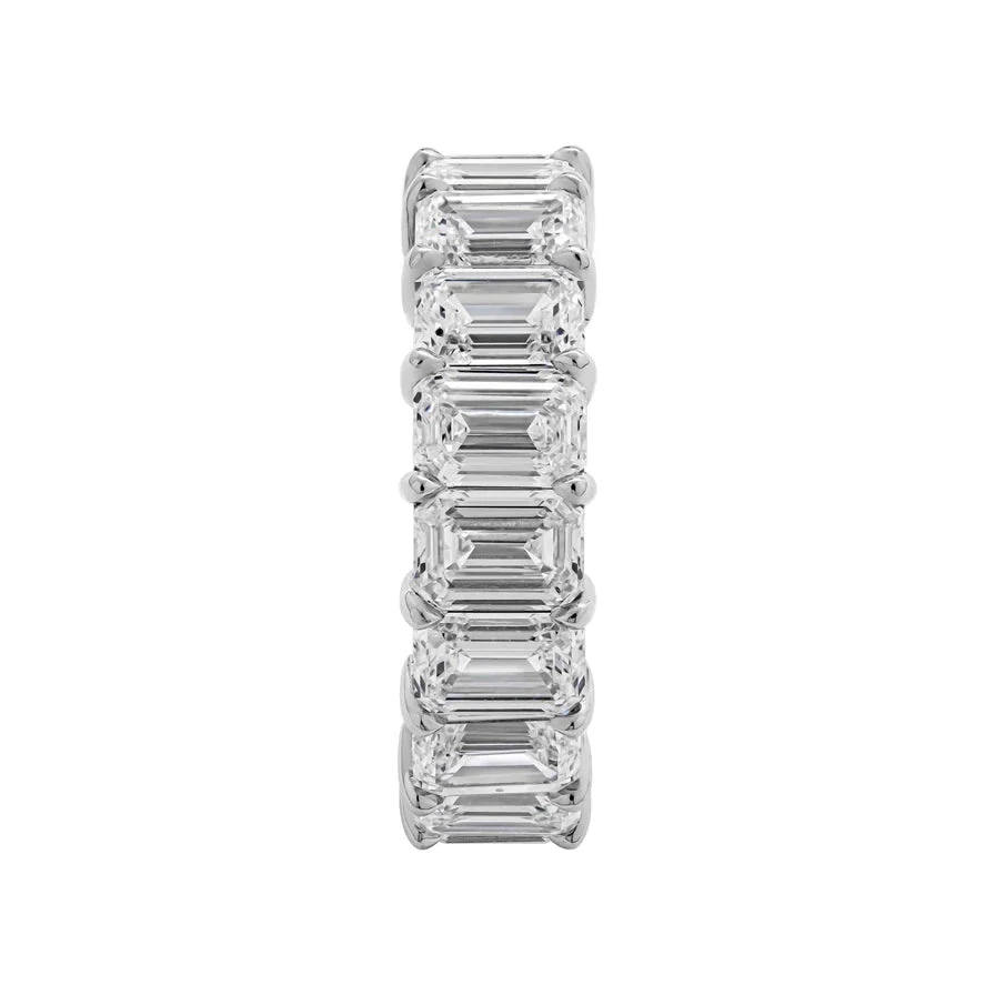 The ZOE Wedding Anniversary Diamond Eternity Band features 17 Emerald Cut 60 pointer diamonds weighing a total of approximately 10.23 carats, Shared Prong in Platinum.